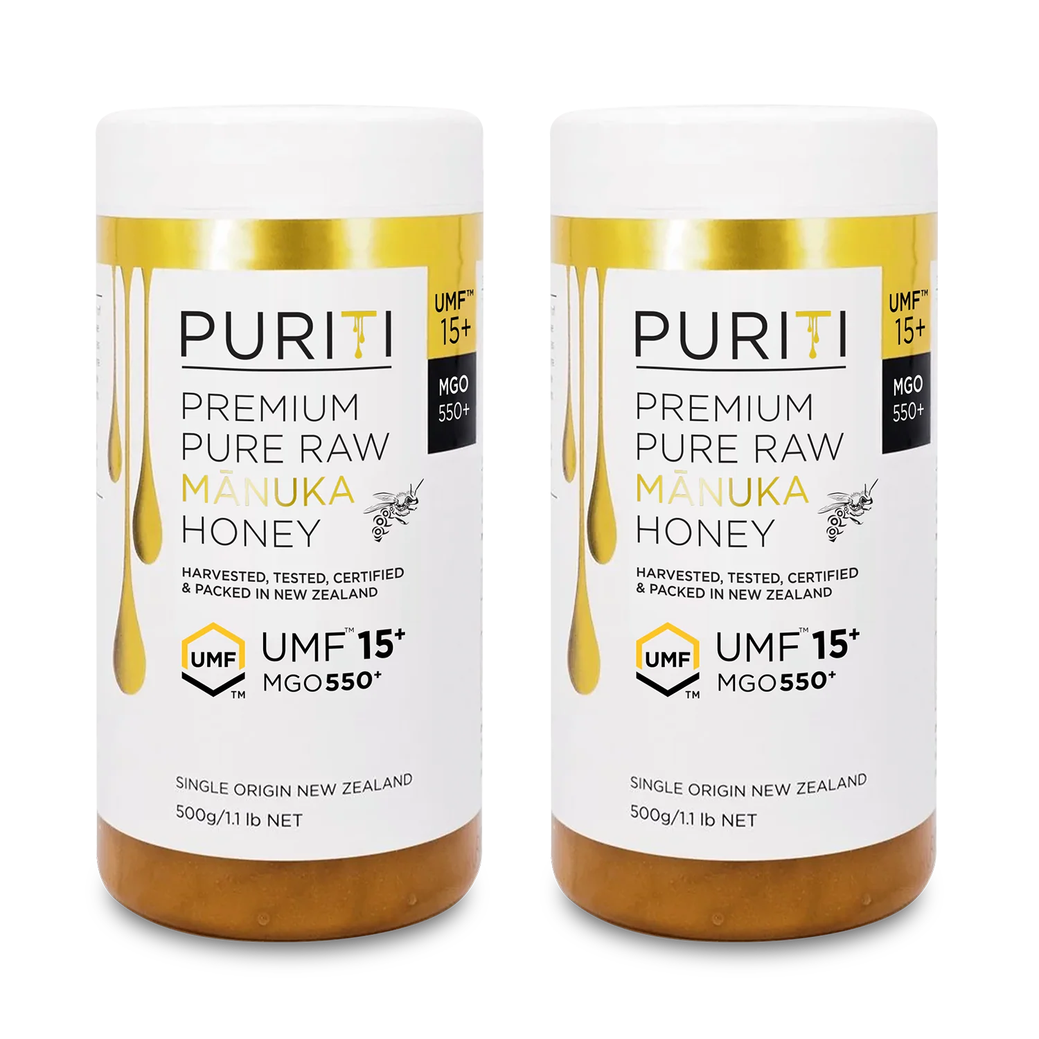 • 2 יחידות של דבש מאנוקה פרימיום PURITI בדרגת UMF™ 15+ MGO 550+, במשקל 500 גרם.